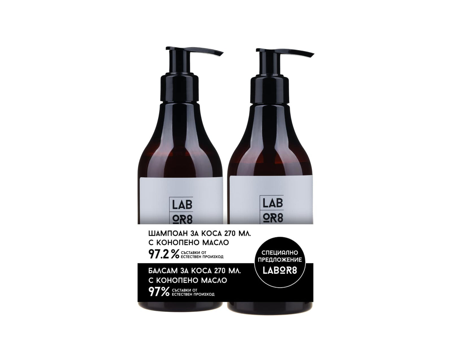 LABOR8 Hemp Hair Shampoo 270 ml + Conditioner 270 ml е двоен комплект за грижа за косата, който подпомага чистотата, подхранването и баланса на скалпа.