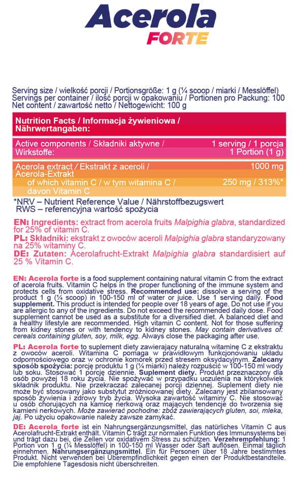 Важно е да се отбележи, че преди употреба на Acerola Forte е препоръчително да се консултирате с лекар, особено ако имате алергии или страдате от специфични здравословни състояния.