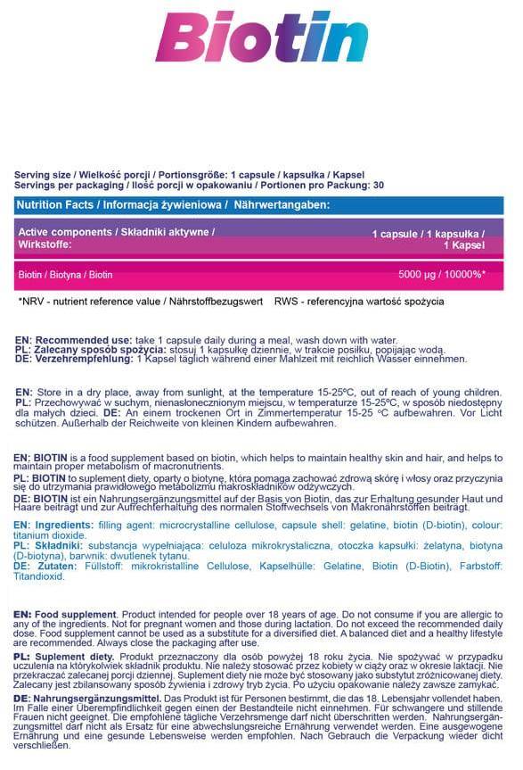 Важно е да се отбележи, че прилагането на добавки с биотин е безопасно, но в редки случаи може да предизвика алергични реакции. Препоръчва се консултация с лекар, особено при бременност или кърмене. Не превишавайте препоръчителната доза.