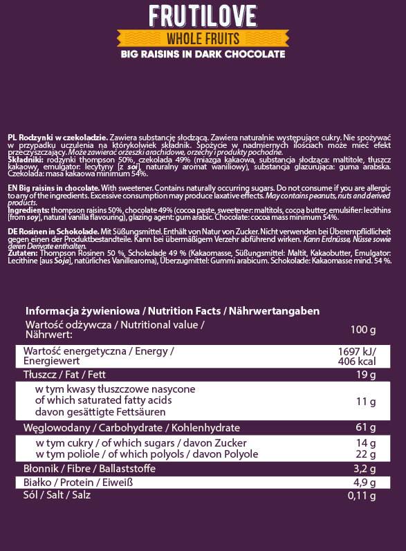 Важно: Продуктът съдържа шоколад и стафиди, които могат да предизвикат алергични реакции при някои хора. Не се препоръчва за лица с непоносимост към шоколад или плодове.