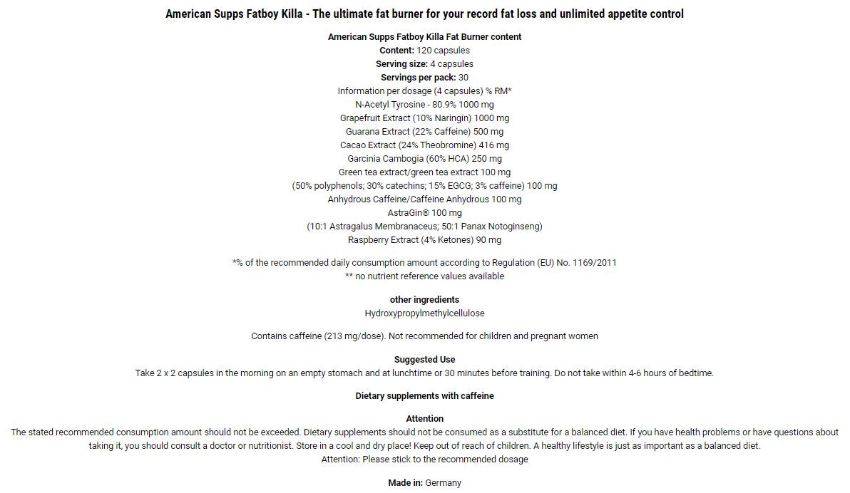 Fatboy Killa® е иновативен фетбърнър от признатия номер едно бранд за течни хранителни добавки. Тази формула, разработена в Германия, е създадена с основна цел да подпомогне изгарянето на мазнини и да улесни постигането на желаното тегло. Основните активни съставки работят синергично, за да увеличат метаболизма и да стимулират термогенезата, което води до по-ефективно изгаряне на мазнини.
