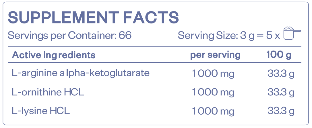 GH AMINO увеличава количеството на азотен оксид, което подобрява кръвоснабдяването и помпата по време на тренировка. Комбинацията от Л-орнитин, Л-Лизин и Л-аргинин алфа-кетоглутарат дава подкрепа за подобрен мускулен тонус и по-добра усвояемост на хранителните вещества по време на усилие.