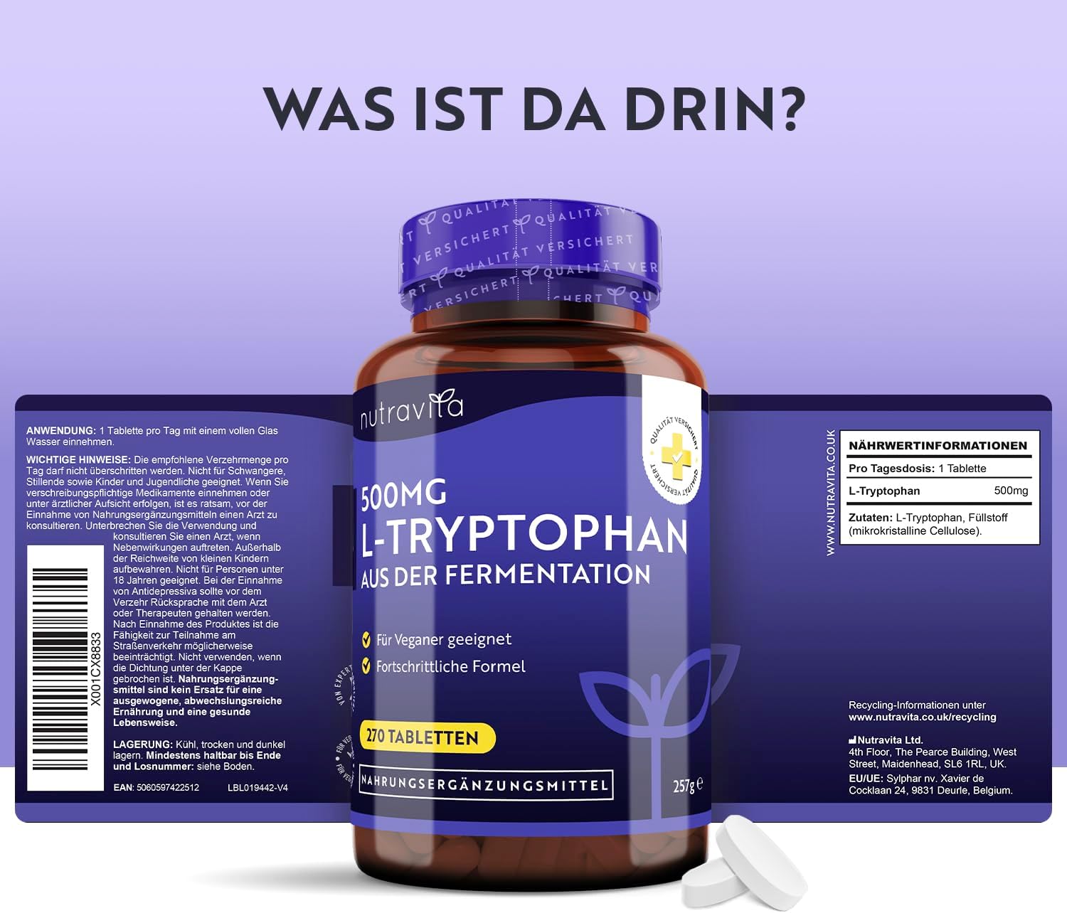 Всяка таблетка съдържа 500 mg L-Триптофан (от ферментация) с висока концентрация. Тези таблетки се произвеждат в Германия в производствено съоръжение, което отговаря на строги стандарти за качество. Нашите таблетки не съдържат никакви алергени като пшеница, ядки и соя.
