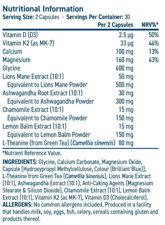 Тази специална формула е създадена за възрастни, които търсят естествен начин да намалят хроничния стрес и да постигнат по-пълноценен, възстановителен сън. Комбинацията от адаптогените Ашваганда и L-Theanine в съчетание с биологично активния Lion's Mane подпомага спокойствието на ума и плавното навлизане в сън през нощта. Формулата е с висока усвоемост и е подходяща за ежедневна употреба в контекст на поддържаща грижа за сън.