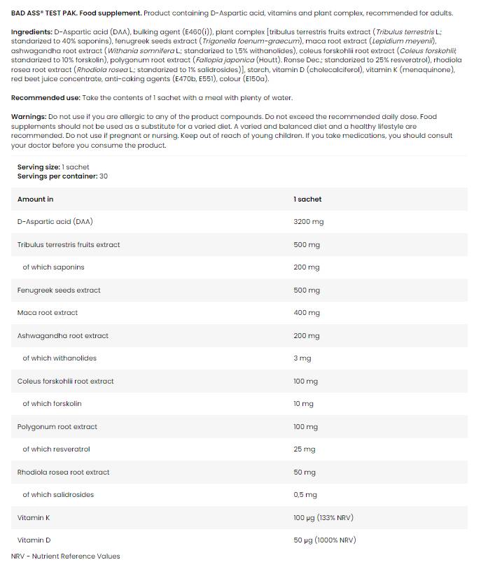 BAD ASS® TEST PAK (Bad Ass Nutrition) представлява мощен тестостеронов комплекс, специално създаден за мъже, който е лидер в категорията на те течни хранителни добавки. Тестостеронът е основен хормон, отговорен за множество аспекти на мъжкото здраве, включително енергия, либидо и мускулна сила.