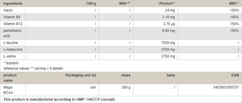 MEGA-BCAA 5000 съдържа аминокиселините L-Leucine, L-Isoleucine и L-Valine (1:1:2) в разклонени вериги, както и важния за усвояването на азота витамин B. Благодарение на новия High-tech метод за пресоване на таблетки и най-модерния в момента процес за филтриране Cross, в Mega-BCAA 5000 са кондензирани значително повече и по-висококачествени aминокиселини и пептиди в таблетка, отколкото в обичайните продукти от този тип.