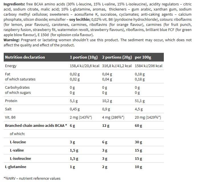 BCAA Xplode е перфектният продукт за вас! За да засилите анти – катаболния ефект на продукта, неговият състав е обогатен с добро количество л – глутамин, която е втората най – значима съставка за мускула след BCAA.