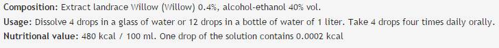 480 ккал / 100 мл. Една капка от разтвора съдържа 0.0002 ккал.