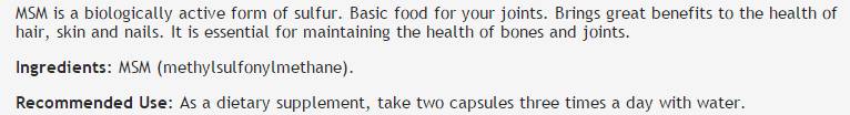 Научни изследвания показват, че МСМ може да има противовъзпалително действие, което е полезно при заболявания на ставите, като остеоартрит. Важно е да се спазват препоръките за дозировка, за да се избегнат нежелани реакции. Консултирайте се с лекар, ако имате съществуващи здравословни проблеми или сте бременна/кърмеща.