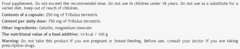 Внимание: Не използвайте Tribulus Terrestris, ако сте бременна или кърмите. Консултирайте се с лекар, ако приемате лекарства по рецепта. Не превишавайте препоръчваната доза и не го използвайте при деца под 18 години.