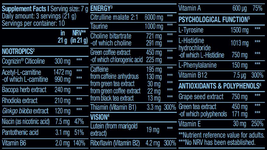 Формулата включва L-цитрулин, L-тирозин, ацетил-L-карнитин, таурин и много други, които са внимателно подбрани, за да осигурят оптимални резултати. За пълния състав на продукта, моля, погледнете втората снимка.