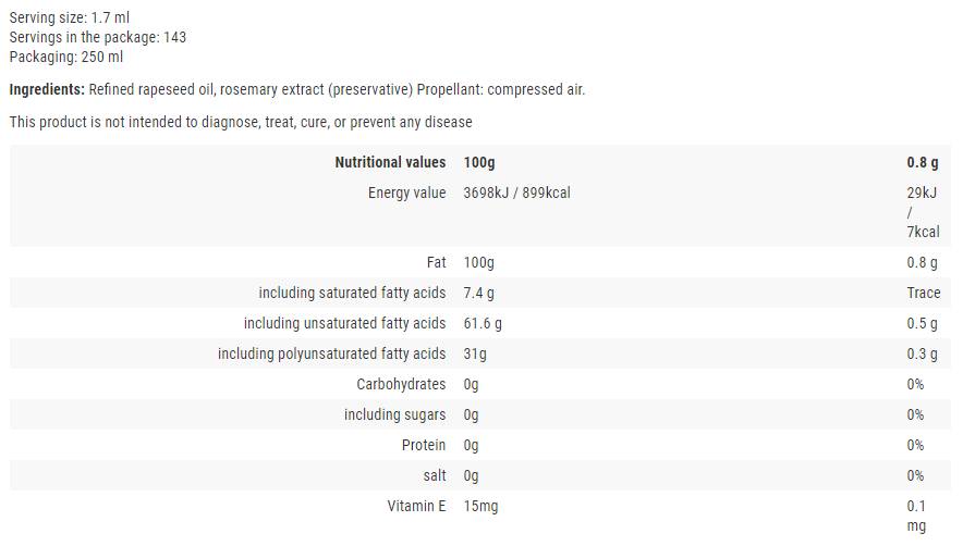 Спреят предлага не само отличен вкус, но и удобство при готвене, като позволява прецизно нанасяне на мазнината. Икономичната разфасовка осигурява дълготрайна употреба, а с само 7 калории на доза, можете да се насладите на любимите си ястия без угризения.