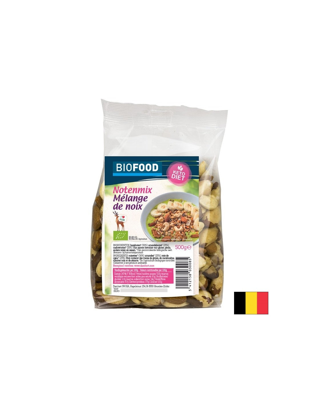 Notenmix Melange de noix / Сурови ядки микс, БИО, 500 грама е висококачествен био микс от сурови ядки, съчетаващ бразилски орех, бадеми и кашу. Този продукт е сертифициран като органичен, а ядките са произведени по методите на контролираното био земеделие. Това гарантира липса на химикали, пестициди и ГМО, като по този начин съхранява чистотата и високите хранителни свойства на ядките. Подходящ е за вегани и е отличен избор за хора, които търсят здравословен източник на енергия и полезни хранителни вещества.