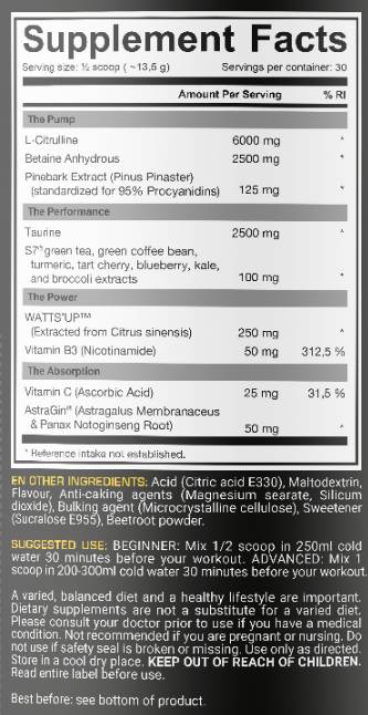 Тази формула използва чист L-цитрулин за повишаване на азотния оксид и подобряване на кръвообращението, което води до по-силни помпи. Формула с висока усвоемост включва Бетаин, екстракт от кора на бял бор (Pine Bark), S7™, Таурин, екстракт от цитрус синенсис (Watt’s Up™) и AstraGin™, за оптимално усвояване и резултати по време на тренировка.