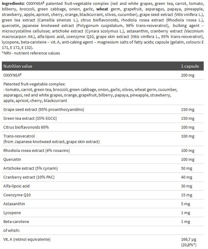 В основата на ефикасността на най-новият продукт ANTI – OX power blend™, създаден в лабораториите на OLIMP е комплекс от 36 активни растителни компонента, които многостранно се борят със свободните радикали, до пълното им унищожение. Разработен специално за спортисти и физически активни хора, ANTI – OX power blend™ се състои от