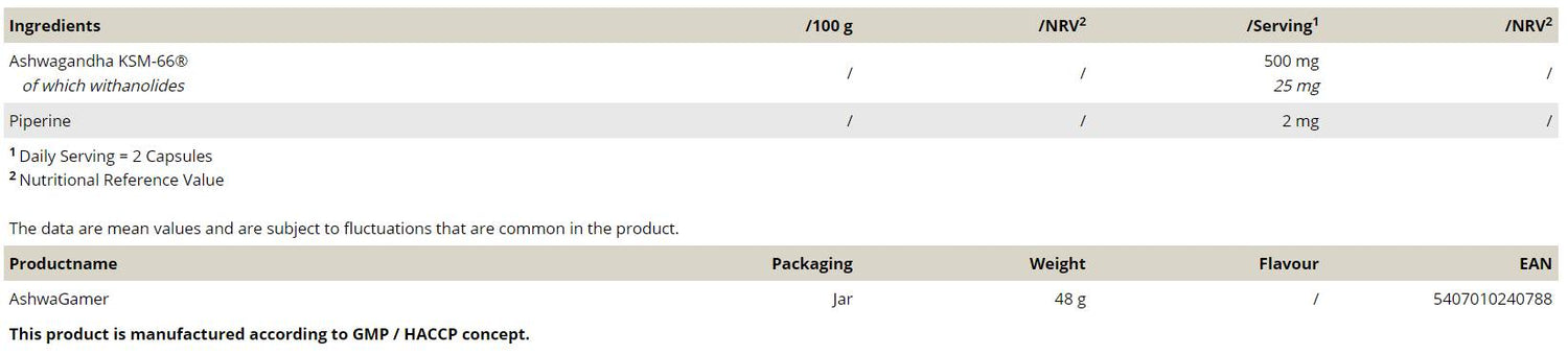 AshwaGamer | with 500 mg Ashwagandha KSM-66® - 60 капсули