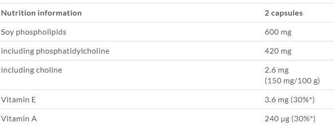 Съставки: соеви фосфолипиди - холин, фосфатидилхолин, витамин Е, витамин А