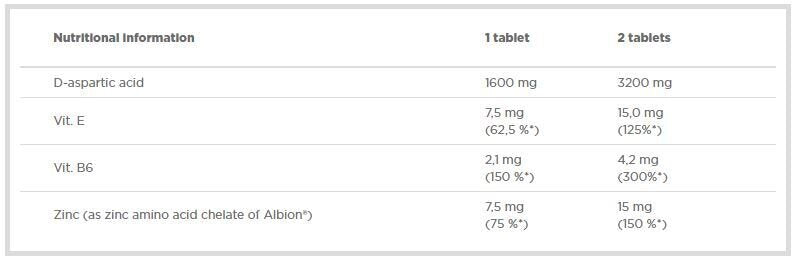 Съставки:D-аспарагинова киселина, Витамини Е и B6, Цинк ( като хелат на Albion® )