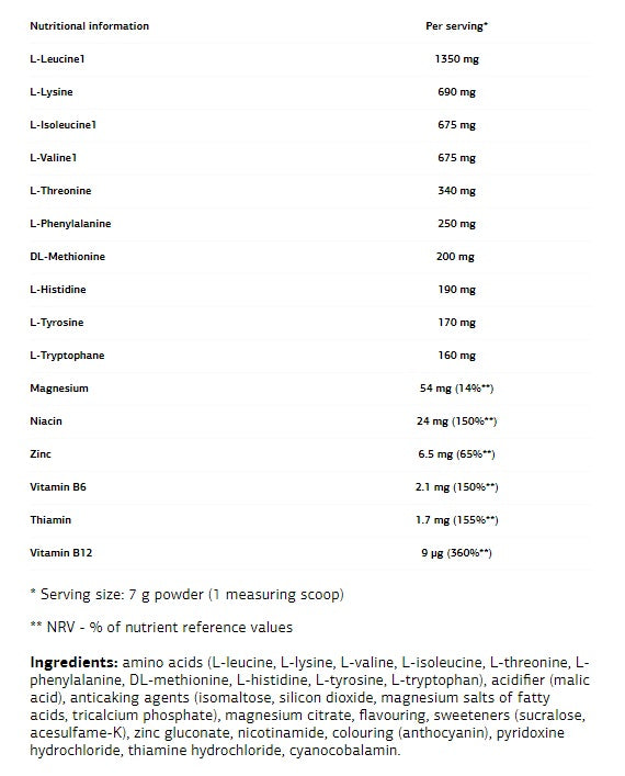 Съставки: Аминокиселинен комплекс; L-Leucine, L-lysine, L-Isoleucine, L-Valine, L-Phenylanine, L-Threonine, L-Histedine, L-Methionine, L-Tryptophane