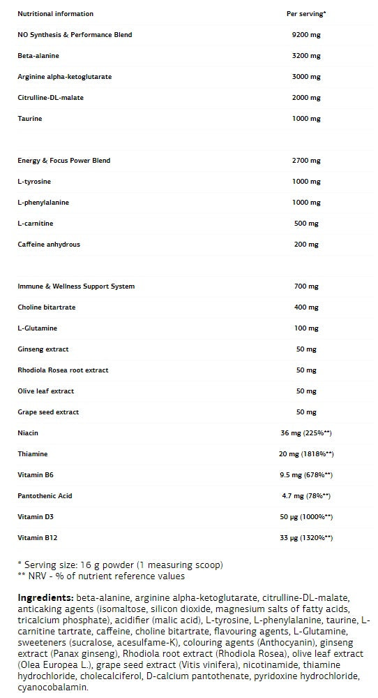 Тази предтренировъчна напитка съдържа комплекс от съставки, които стимулират организма, като безводен кофеин и таурин. Те сигурно ще стимулират отделянето на адреналин, който ще мобилизира енергийните пътища на системата, за да се извърши повече тренировъчна работа. Основният комплекс от съставки на
