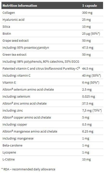Съставки: колаген (хидролизиран желатин), екстракт от зелен чай (98% полифеноли, 80% катехини, 55% EGCG), екстракт от гроздови семки, минерални компоненти (Albion® цинков аминокиселинен хелат, Albion® манганов аминокиселинен хелат, Albion® меден аминокиселинен хелат , Albion® селен хелат на аминокиселината), витамини (L-аскорбинова киселина – витамин C PureWay-C®, dl-á-токоферол – витамин E, D-биотин), натриев хиалуронат, колоиден силициев диоксид, бета-каротин, ликопен, L -цистин, цитрусови биофлавоноиди, микрокристална целулоза – пълнител, магнезиев стеарат – агент против слепване, капсула (желатин – компонент на обвивката, цвят: E171, E104, E110)