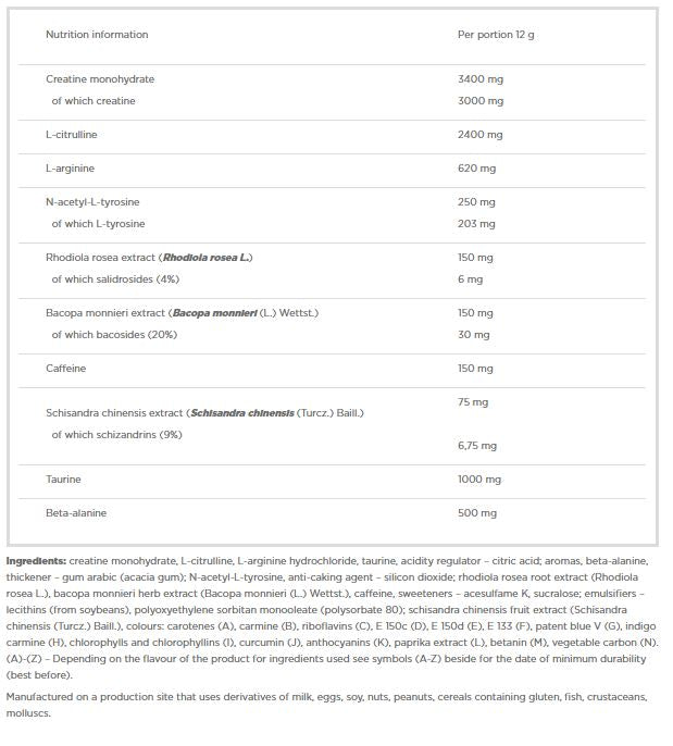 Съставки: креатин монохидрат, L-цитрулин, L-аргинин хидрохлорид, таурин, регулатор на киселинността - лимонена киселина; аромати, бета-аланин, сгъстител - гума арабика (акациева смола); N-ацетил-L-тирозин, средство против слепване - силициев диоксид; екстракт от корен на rhodiola rosea (Rhodiola rosea L.), екстракт от билка bacopa monnieri (Bacopa monnieri (L.) Wettst.), кофеин, подсладители - ацесулфам К, сукралоза; емулгатори - лецитини (от соя), полиоксиетилен сорбитан моноолеат (полисорбат 80); екстракт от плодове schisandra chinensis (Schisandra chinensis (Turcz.) Baill.), цветове: каротини, кармин, рибофлавини, E 150c, E 150d, E 133, патентово синьо V, индиго кармин, хлорофили и хлорофилини, куркумин, антоцианини, екстракт от червен пипер, бетанин, растителен въглерод