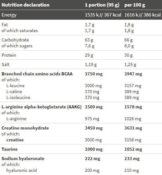 Уникална, научно разработена матрица от свободни аминокиселини, пептиди, бавно и бързо усвояващи протеини, добити от най-качествени: хидролизат и изолат на суроватъчен протеин, мицеларен казеин и глутамини пептиди. Тази новаторска хранителена матрица е избрана специално за осигуряване на непрекъснато наличие на анаболни вещества от решаващо значение за мускулната регенерация и растеж, получени от източници с различни амино-профили, усвояване и кинетика. Този състав гарантира бърза и трайна доставка на най-ценните хранителни и анаболни вещества за растеж на мускулите.