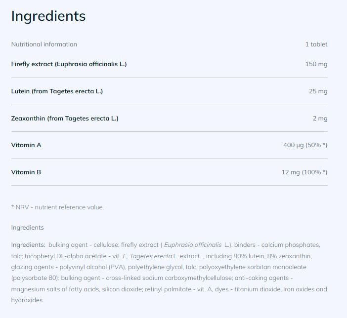 Съставки: пълнител: целулоза; екстракт от очника (Euphrasia officinalis L.), свързващи вещества: калциеви фосфати, талк; DL-алфа-токоферил ацетат: витамин Е, екстракт от африкански невен (Tagetes erecta L.), включително 80% лутеин, 8% зеаксантин, глазиращи агенти: поливинилов алкохол (PVA), полиетилен гликол, талк, полиоксиетилен сорбитан моноолеат (poly80 ); пълнител: омрежена натриева карбокси метил целулоза; противослепващи агенти: магнезиеви соли на мастни киселини, силициев диоксид; ретинил палмитат: витамин А, оцветители: титанов диоксид, железни оксиди и хидроксиди