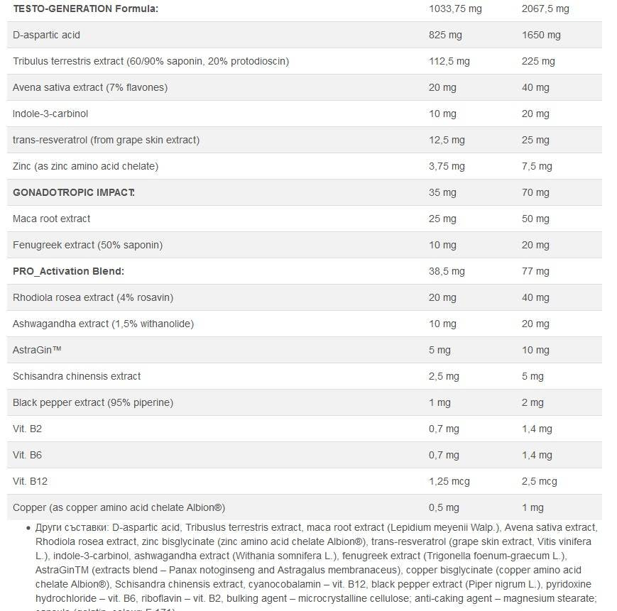 Olimp T-100 Male Testo Booster съдържа всичко от което се нуждаете, за да доведете производството на тестостерон до най-високите нива. Всяка доза съдържа 5 формули и клинично изпитани елементи, които работят в синергия и гарантират, че андрогенните рецептори се стимулират непрекъснато за да се произведе повече тестостерон.