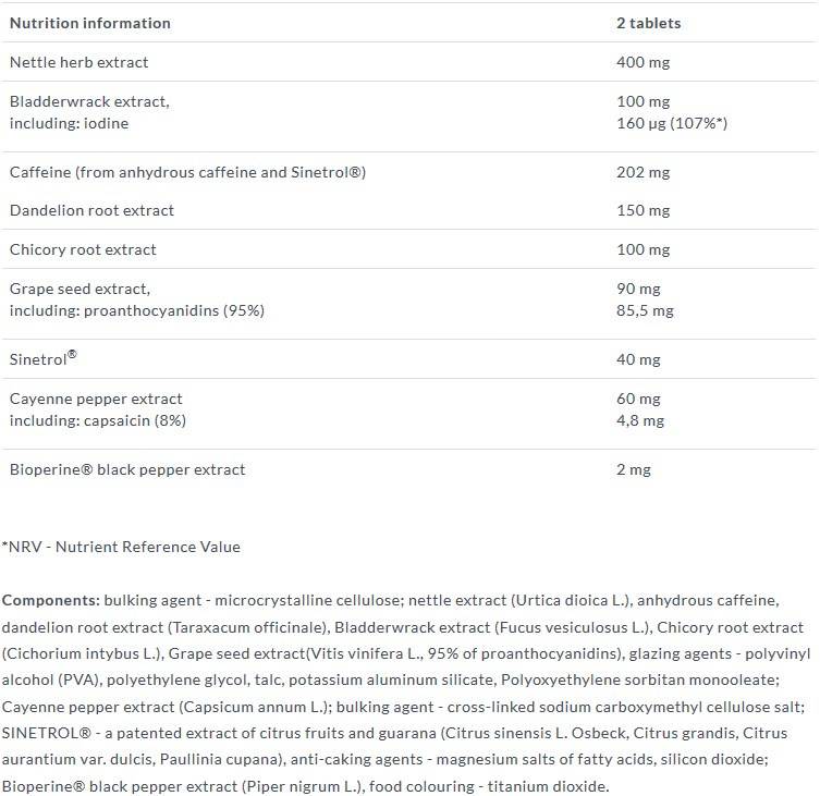 Pepper Cayenne - подпомага изгарянето на мазнините, помага борбата с целулита. Глухарче,коприва,цикория - благоприятстват за отстраняването на вода от организма, засилват метаболизма и подпомагат детоксикацията на организма, а също и стимулират храносмилането.
