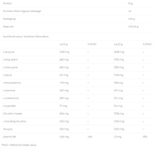 Състав: L-левцин, L-лизин, L-треонин, аромати, L-валин, L-изолевцин, L-аргинин, лимонена киселина, L-метионин, L-фенилаланин, L-хистидин, L-триптофан, оризово нишесте, сукралоза, силициев диоксид, багрило (E124).