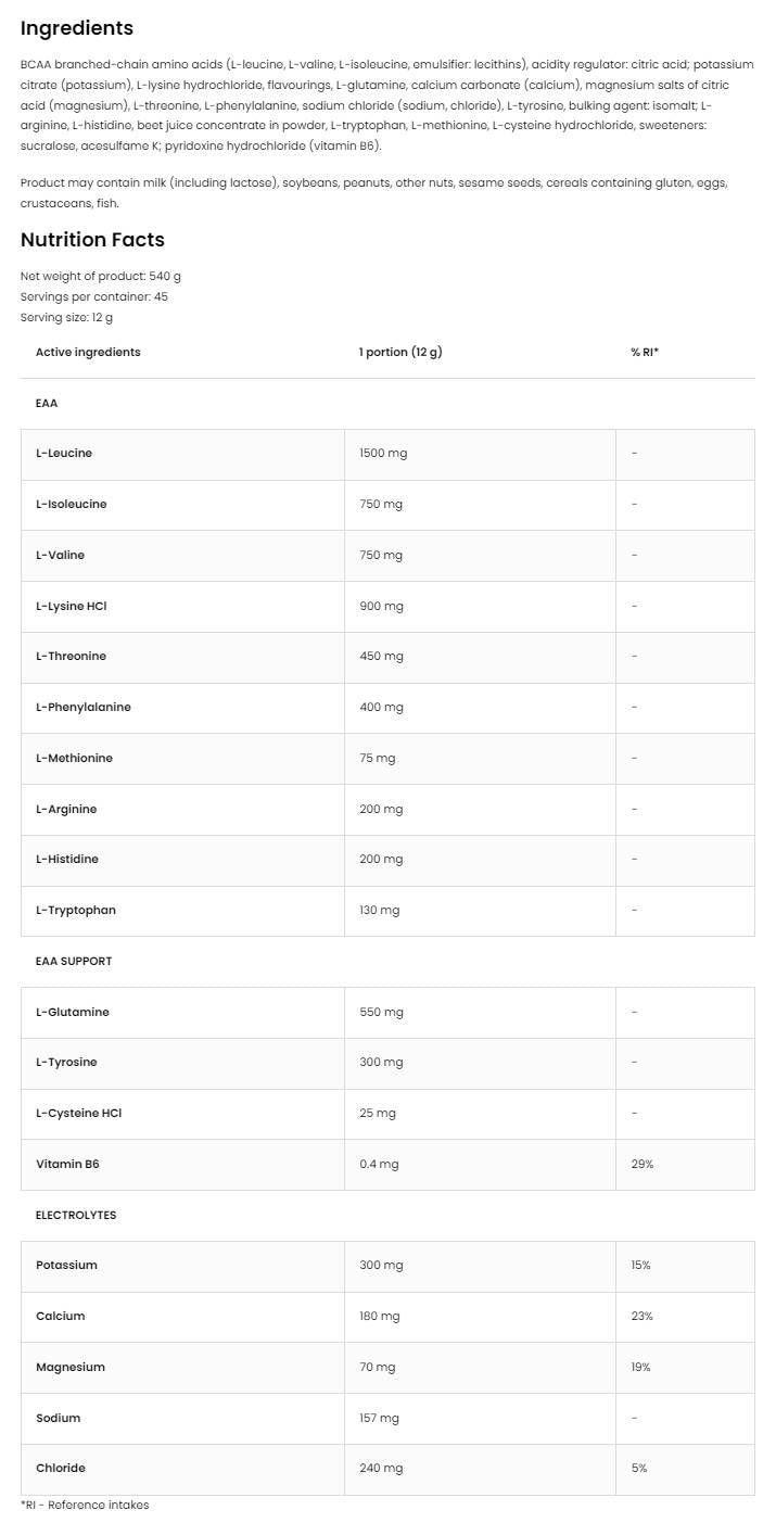 Електролитите, от друга страна, до голяма степен са отговорни за хидратацията и поддържането на водно-електролитния баланс на нашите клетки. При предприемане на повишена физическа активност търсенето на тези хранителни вещества се увеличава и не винаги е възможно да се осигурят в достатъчни количества с храната. Тогава си струва да обмислите допълнителни добавки, позволяващи, особено на спортистите, да допълват ежедневната си диета и да подкрепят процеса на регенерация след тренировка с незаменими аминокиселини и минерали.