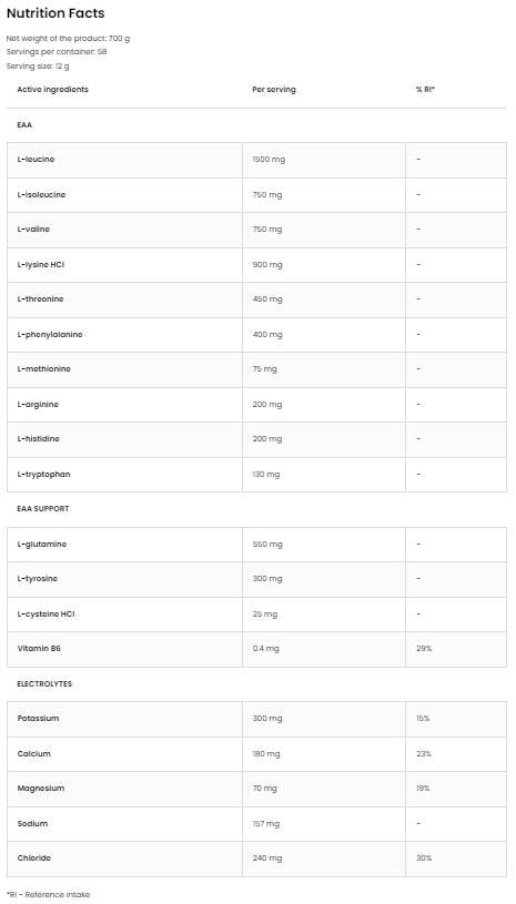 EAAdvanced | With Glutamine And Electrolytes е висококачествена прахообразна хранителна добавка, предлагана в три вкусни плодови вкуса. Препаратът представлява цялостна комбинация от аминокиселини EAA и BCAA с минерали. Разработен е от най-висококачествени съставки за всички физически активни хора, които се грижат за правилното допълване на нивото на аминокиселини и електролити в ежедневната си диета и по този начин подпомагат процеса на регенерация след тежки и интензивни тренировки.