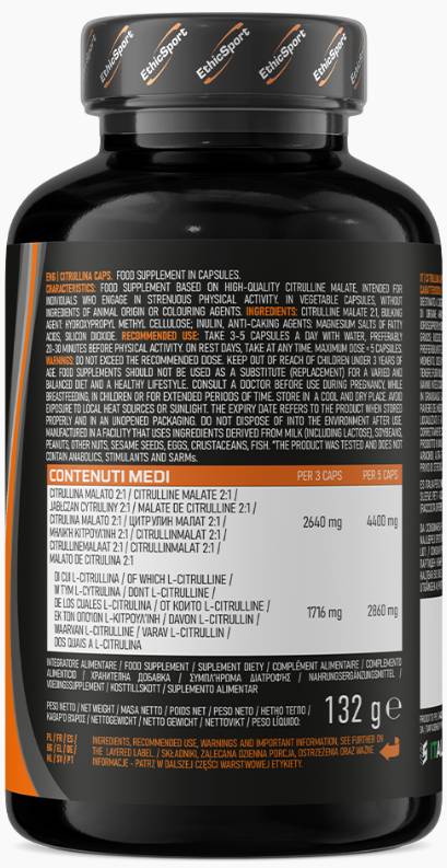 EthicSport Citrullina Caps 880 mg е висококачествена хранителна добавка с цитрулин малат 2:1, предназначена за спортисти и активни хора, търсещи естествен начин за повишаване на азотния оксид, подобряване на кръвообращението и увеличаване на издръжливостта.