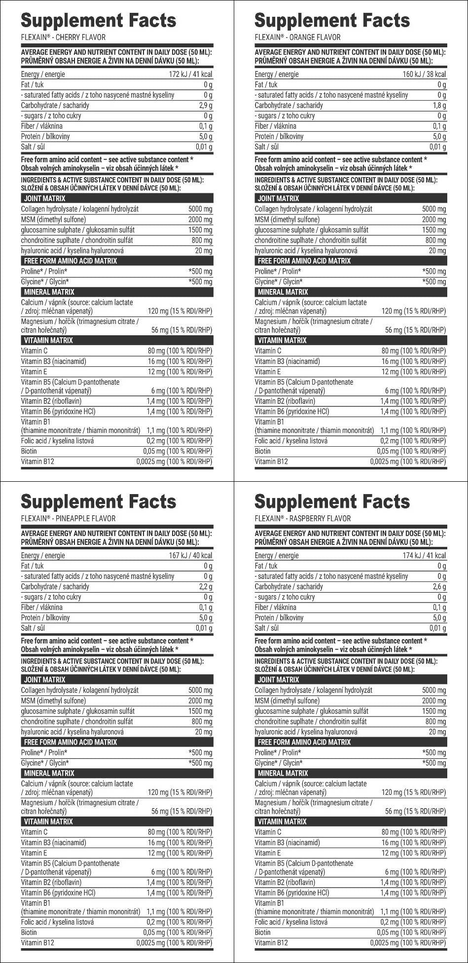 → FLEXAIN съдържа комбинация от всички вещества, които са от съществено значение за добрата функция на ставата: колаген хидролизат (колагенови пептиди), MSM, хондроитин сулфат, глюкозамин сулфат, хиалуронова киселина, минерали калций и магнезий и свободни аминокиселини пролин и глицин. витамин комплекс, от които особено витамин С допринася за нормалното образуване на колаген за нормална функция на кръвоносните съдове, хрущялите и костите.