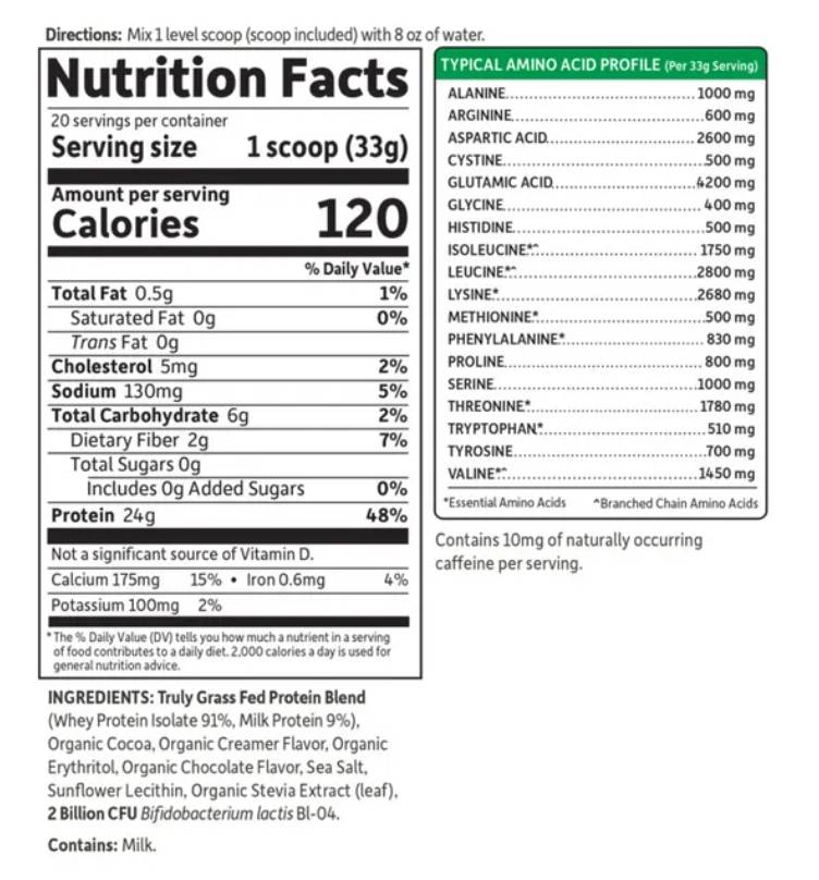 Sport Certified Grass Fed Whey Protein е предназначен за зареждане и възстановяване на мускулите. Интензивните тренировки и упражнения разграждат мускулната тъкан и след това тялото се възстановява и възстановява, за да ги направи по-силни. Една порция доставя 24 g пълноценен протеин от суроватъчен протеин изолат като основен източник с добавен млечен протеин, за да осигури някои от полезните компоненти, открити само в пълномасленото мляко, като имуноглобулини и полезни растежни фактори.