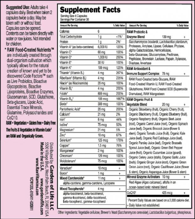 При разработването на Формулата за жени (Vitamin Code Women’s Formula), Garden of Life® обръща специално внимание на сложните функции на женското тяло. Тъй като осигурява подбрани хранителни вещества, които подпомагат здравето на гърдите с добавени витамини D и E, половата система с фолиева киселина, калций, магнезий и цинк, подсилва костите с подходящи количества витамини A, C, D, калций, магнезий и цинк, Формулата за жени (Vitamin Code Women’s Formula) е основна комбинация за жените.