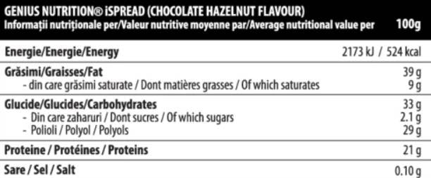 iSpread е протеинов продукт за намазване с шоколад и лешник, който е по-здравословна алтернатива на традиционните продукти за намазване, съдържащи захар и палмово масло. iSpread има отличен и автентичен вкус и е без добавена захар. Произвежда се с висококачествен суроватъчен протеинов изолат, получен чрез естествена филтрация.