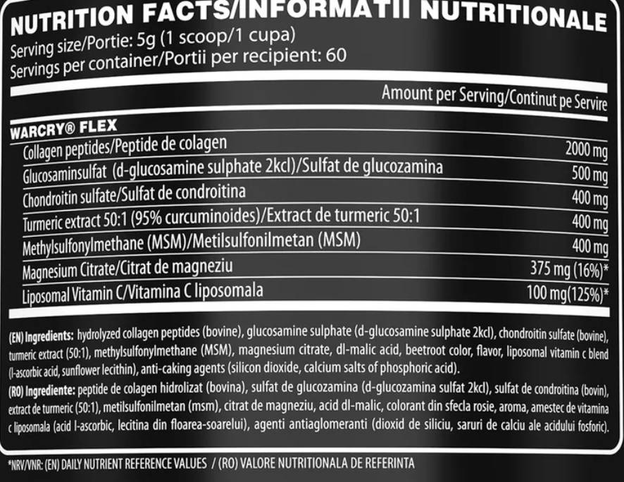 Със своята формула от колагенови пептиди и естествени активни съставки, Warcry Flex подпомага обновяването на хрущялните тъкани и поддържа здравето на свързаните стави. Подходящ е за активни хора, спортисти и за тези, които търсят дълготрайна мобилност и комфорт в ежедневието. Куркуминът има противовъзпалително действие, което помага за намаляване на дискомфорта след натоварване, а колагенът допринася за здравата структура на връзките и сухожилията.