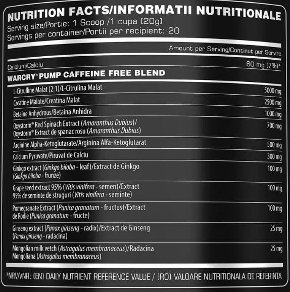 С използваната технология OxyStorm, WarCry Pump подпомага азотния оксид и притока на кислород към мускулите, което води до по-ярка помпа и по-голяма мускулна наситеност при тренировка. Без добавена захар и без стимуланти формулата е подходяща за разнообразни тренировъчни програми и цели.
