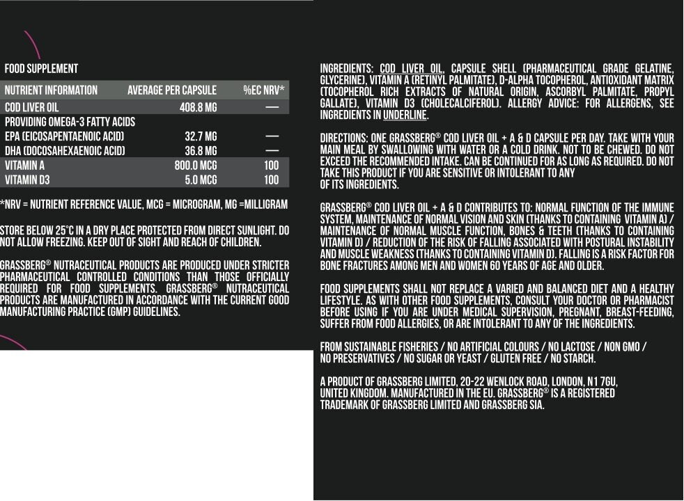 Grassberg Cod Liver Oil + A + D или масло от черен дроб на треска е прочуто като източник на витамини и есенциални мастни киселини. Както се разбира от името, произлиза от черен дроб на треска и се предлага като течна или капсулова добавка.