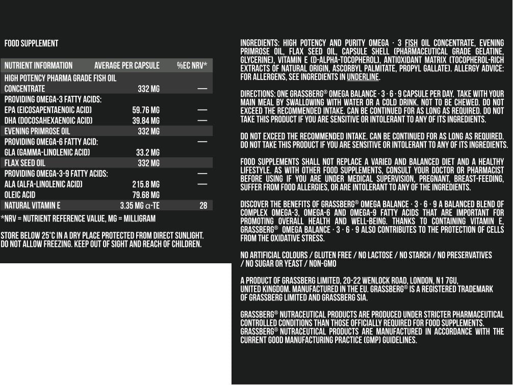 Grassberg Omega 3-6-9 Balance 1000mg е комбинация от важни за здравето ни мастни киселини. Всяка от трите мастни киселини има ползи за здравето ни, но е важно омега 3, 6 и 9 да бъдат в правилен баланс. Съдържа добре балансирана доза от трите полезни ненаситени мастни киселини и витамин Е.
