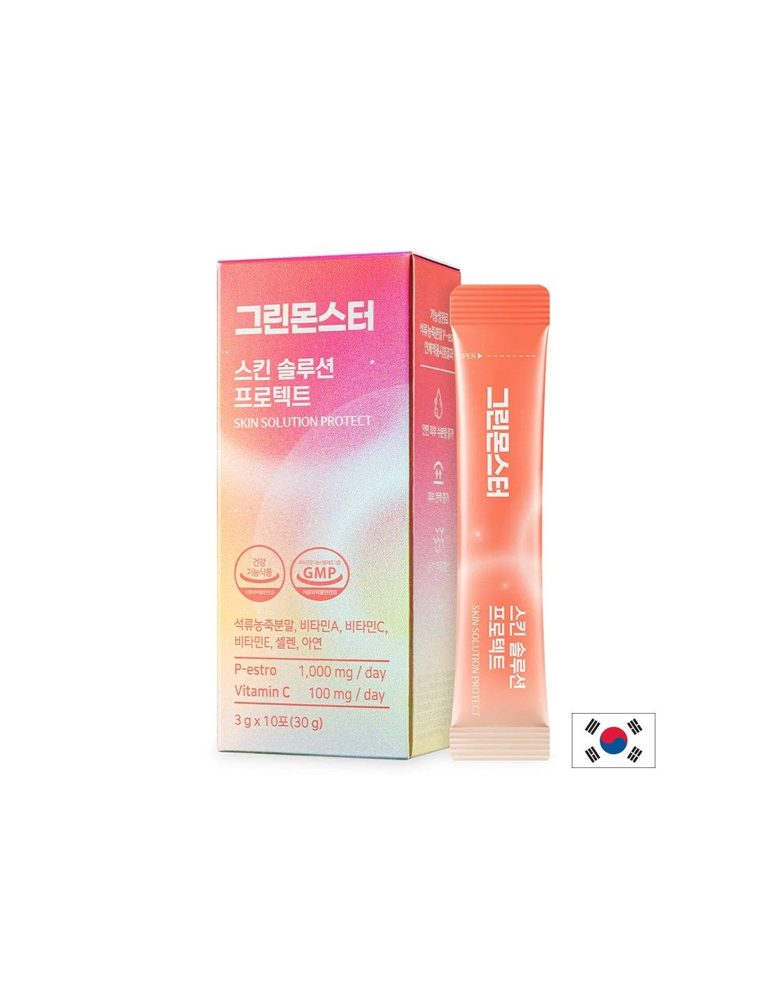 Green Monster Skin Solution Protect - Грижа за кожата е хранителна добавка под формата на прах за разтваряне, създадена в подкрепа на цялостното здраве и красота на кожата. Формулата съдържа внимателно подбрани витамини, минерали и натурални антиоксиданти - витамин A, C, E, селен, цинк и елагова киселина от нар, които осигуряват антиоксидантна защита, подпомагат хидратацията, еластичността и регенерацията на кожата и спомагат за забавяне процесите на стареене. Продуктът спомага за защита от оксидативен стрес, причинен от фактори на околната среда, и подкрепя естествения процес на възстановяване на кожната бариера. Формулата е подходяща при кожа, склонна към сухота, дразнене, зачервяване или ускорено стареене, както и при нужда от допълнителна антиоксидантна защита.