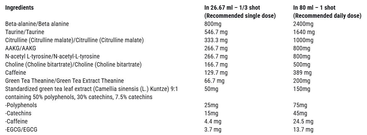 Пийте 1 доза (1 шот) около 20-30 минути преди тренировка.