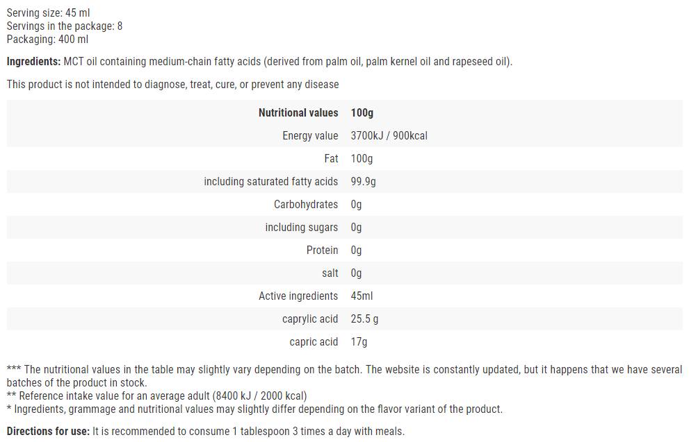Триглицеридите са наситени мазнини със средна верига, състоящи се от мастни киселини, съдържащи от 6 до 10 въглеродни атома. Те се съдържат главно в кокосовото и в палмовото масло.