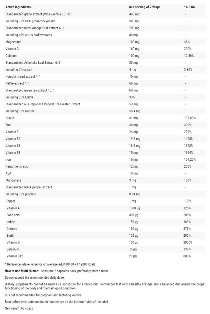 олигомерни проантоцианидини (OPC). Той е многоизмерна подкрепа за вашето тяло, особено поради силното си антиоксидантно действие, което предотвратява развитието на възпаление, причинено от натрупването на свободни радикали. С мултивитамини Multi Human ще предотвратите увреждане на тъканите, ще подобрите ефективността и регенерацията и