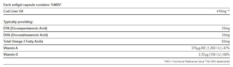 Маслото от черен дроб на риба треска Holland & Barrett е избрано от най-добрите дълбоководна, студеноводна риби. Богат на есенциални Омега 3 мастни киселини, EPA и DHA, които спомагат за поддържане на нормално зрение, сърце и мозъчна функция. Тези капсули също съдържат витамини А и D.