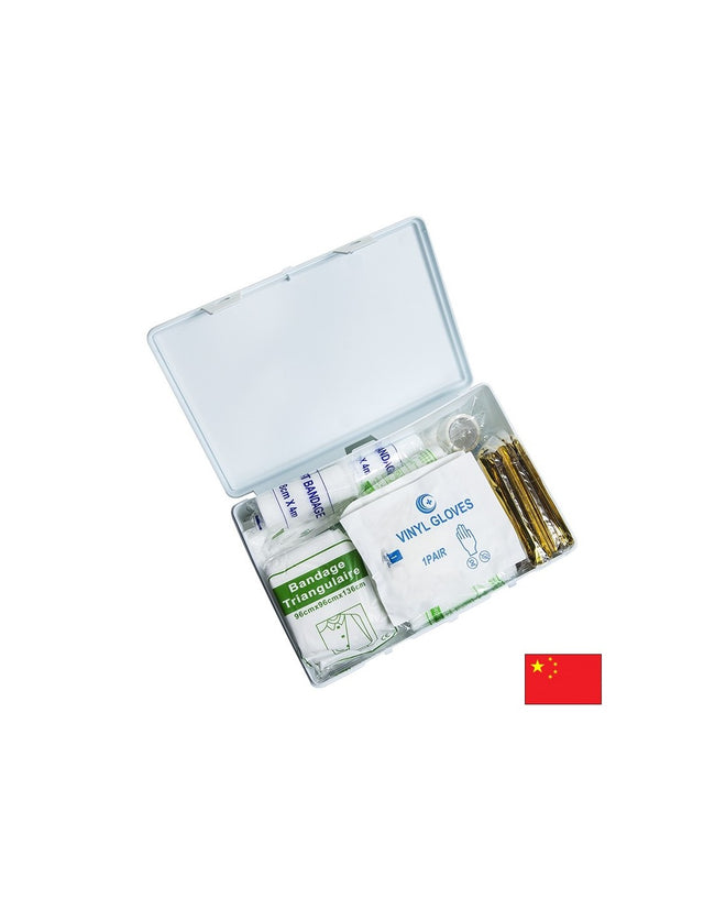 Добре организиран комплект за първа помощ с над 20 вида медицински консумативи за бърза реакция при инциденти, травми и изгаряния.