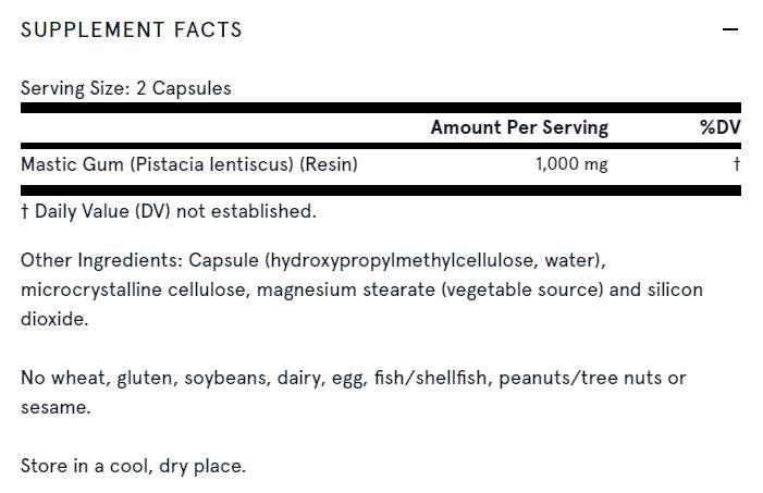 Мастиковата смола е натурален продукт, който е бил използван над 2500 години, за да се насърчава здравето на червата, стомаха и черния дроб. Въпреки това, едва през средата на 1980 г., изследователите потвърдиха ефикасността на мастиковата смола в подкрепа на клетките и тъканите на стомаха и дванадесетопръстника. Установено е, че приема на един грам дневно е безопасна и ефективна подкрепа на здравето на стомаха. В допълнение към неговите антиоксидантни свойства, учени също смятат, че мастиковата смола е полезна за баланса на стомашната секреция.