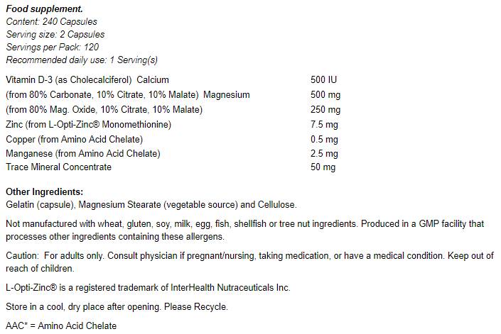 Извлечен от висококачествен калциев карбонат, този източник предлага повече милиграми калций в единица обем, отколкото всеки друг на пазара. Калций е най-разпрозстраненият елемент в човешкото тяло. Той е незаменим за формирането и възстановяването на костите и зъбите, но също така е много важен за мускулните съкращения, съсирването на кръвта, градивен елемент на клетъчните мембрани, процесите на предаване на нервните импулси, както и за други метаболитни процеси. Калций се препоръчва за лечение на остеопороза, алергии, кожни заболявания като екзема и псориазис, и поражения върху черния дроб.